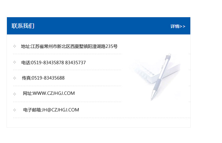 地址:常州市新北區友邦商務大廈1幢16、17層  電話:0519-85101652  傳真:0519-85112595  郵編:213022  網址:www_cz-jiayue_cn.shcwkjxx.com  郵箱:xiajifengaa@163.com